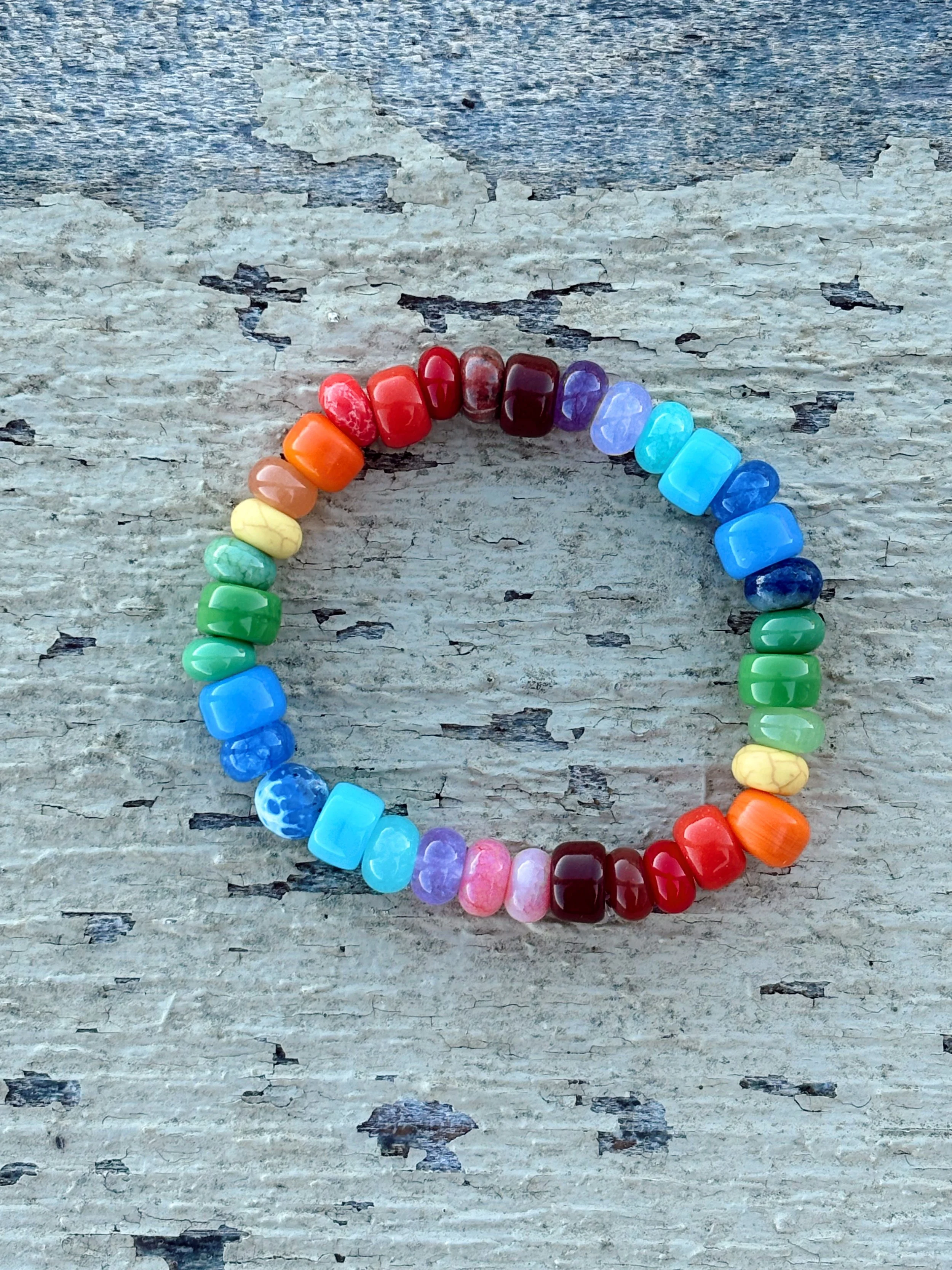 This bracelet almost makes me cry. Nostalgia in the sweetest way. As it was coming into being I could feel the love for its rainbow joy moving up my body into my neck and throat, wanting to just scream out for the pure love I felt for a similar bracelet I had as a little girl in the 80s. I know that 80's bracelet is in a box somewhere. It's now on my to do list to find it.